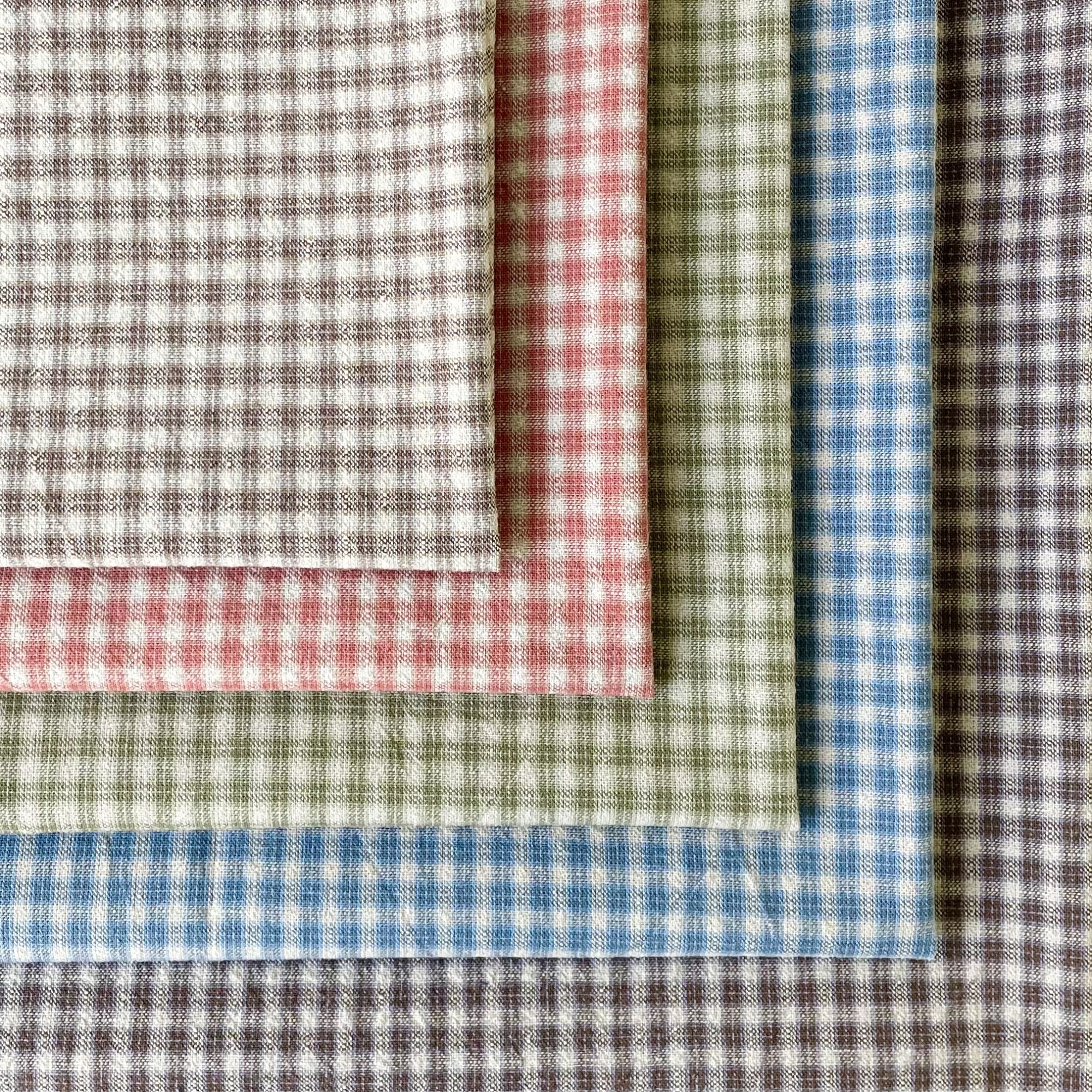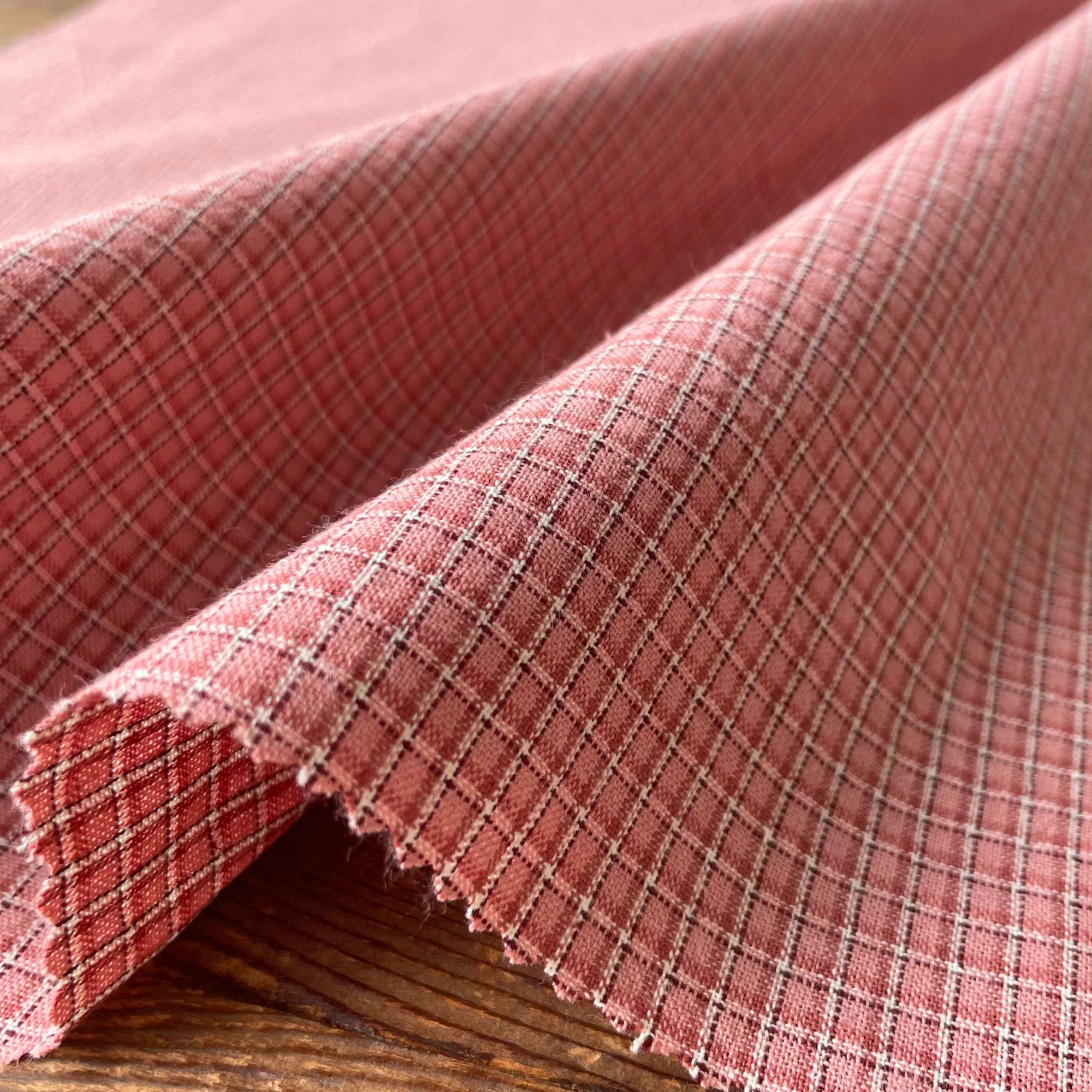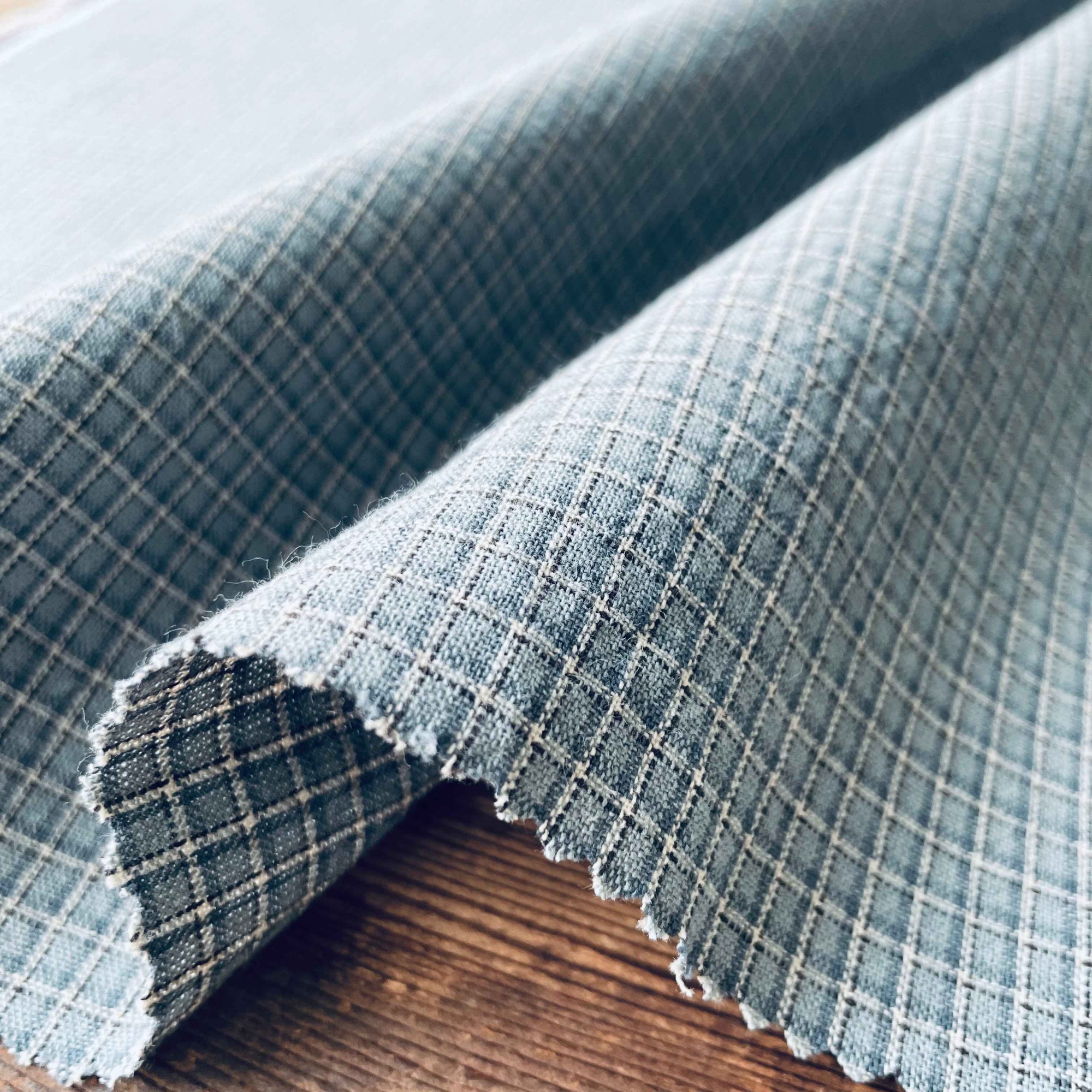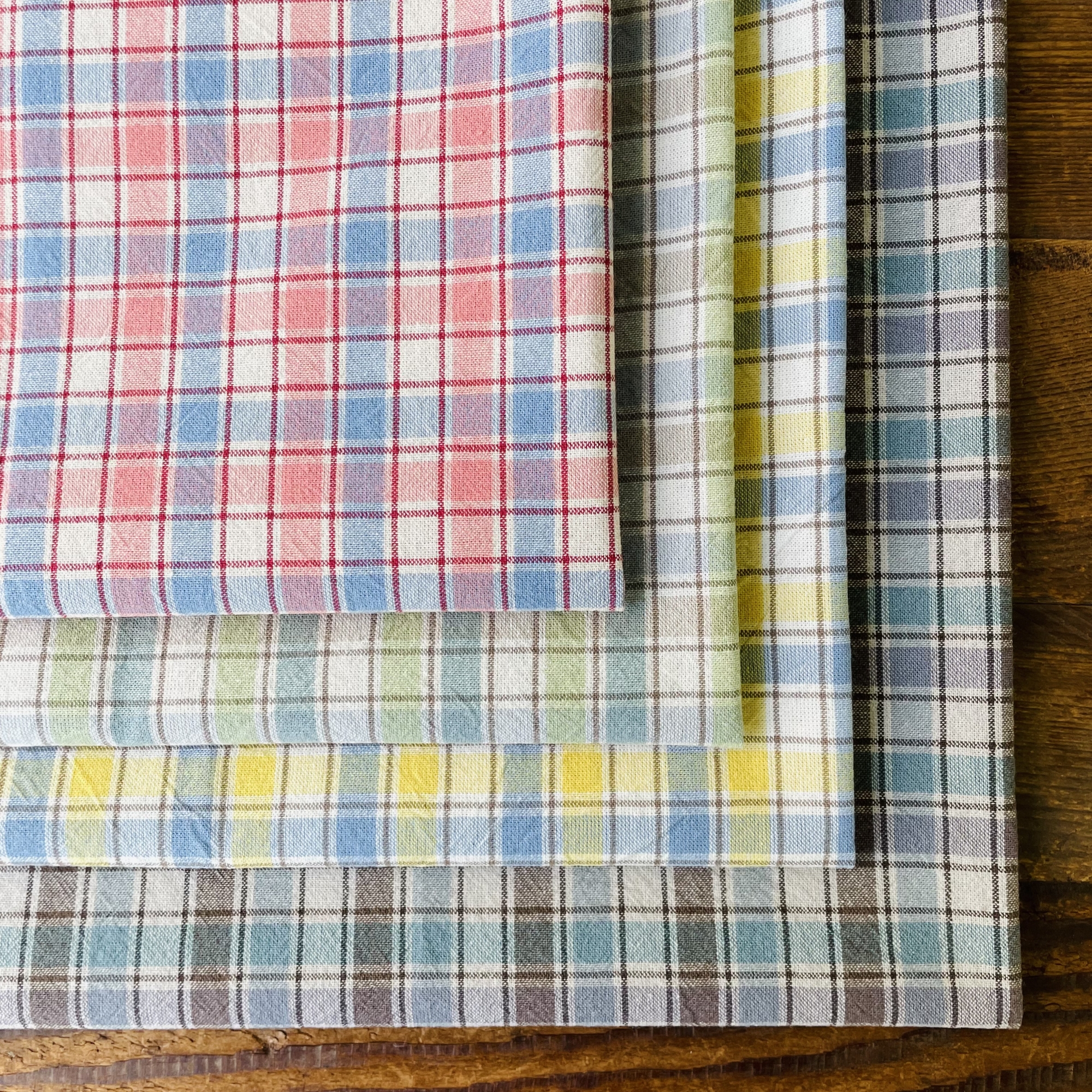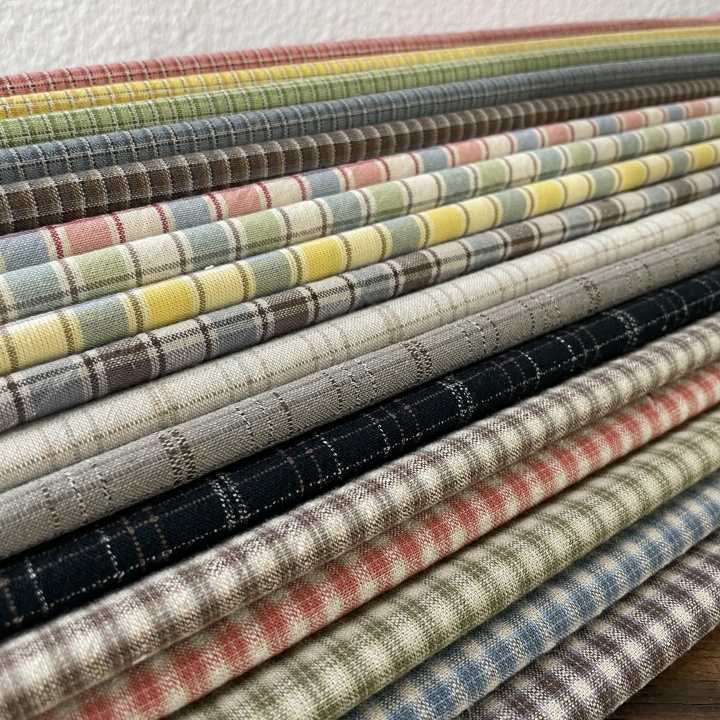 今回、新しい試みで表面がなめらかで無地調の色を楽しめる先染めを作ってみました。先染めはプリントより肉厚感のあるものが多いですが、今回、より細い糸を使用し、アメリカのアンティークキルトで使われているような、フラットでシャツ地ライクな生地に仕上げました。