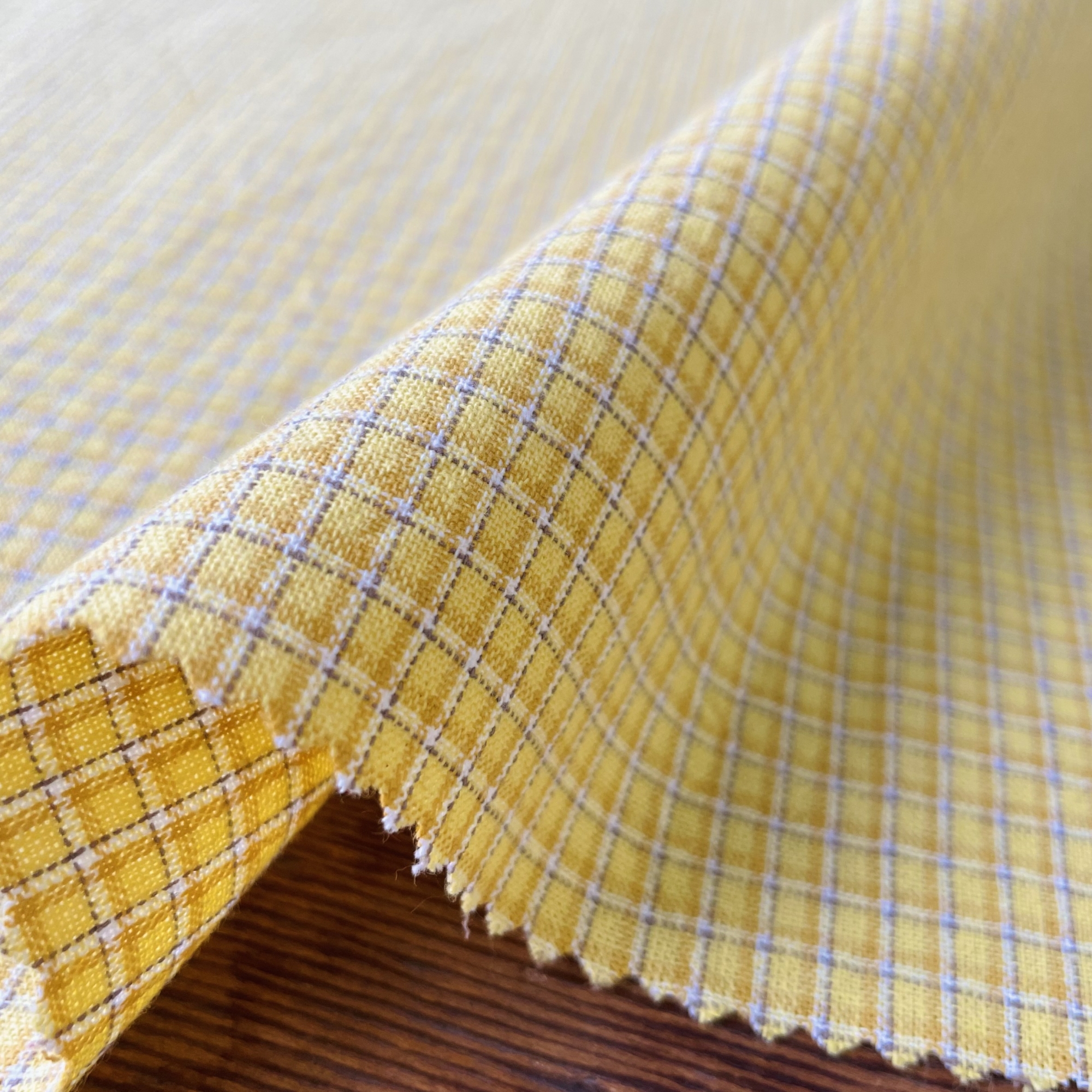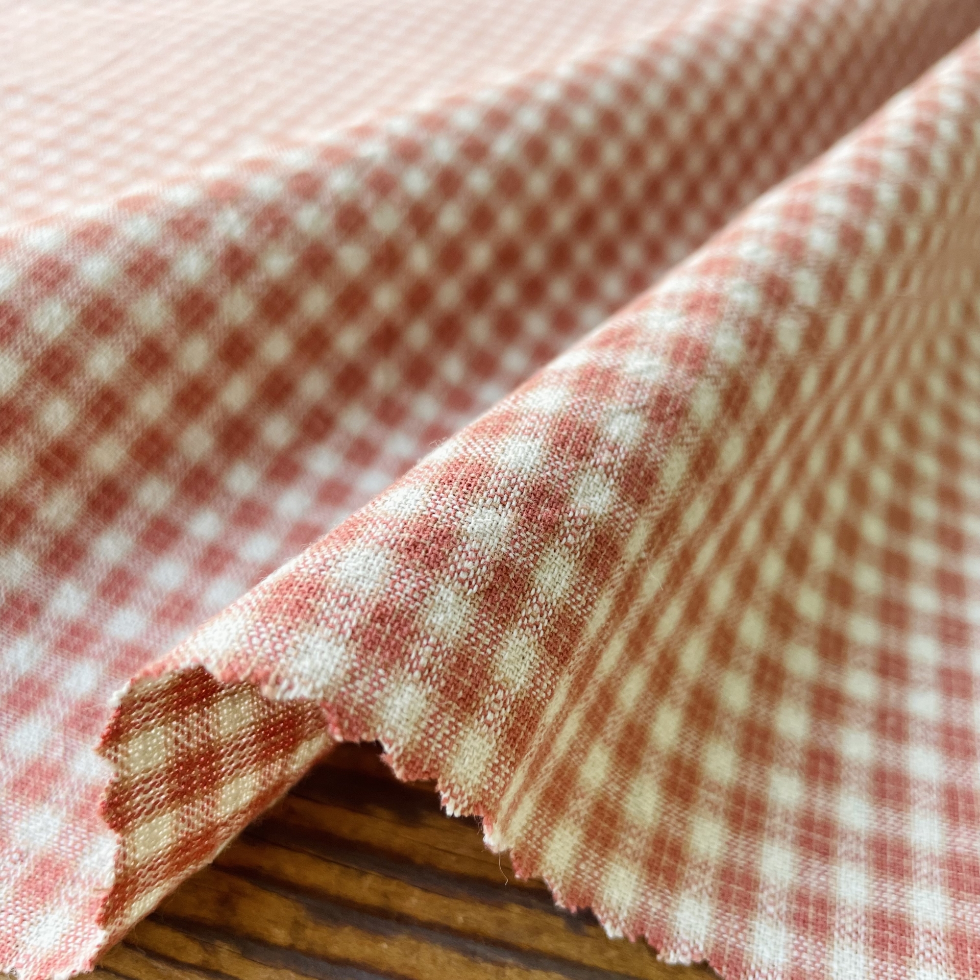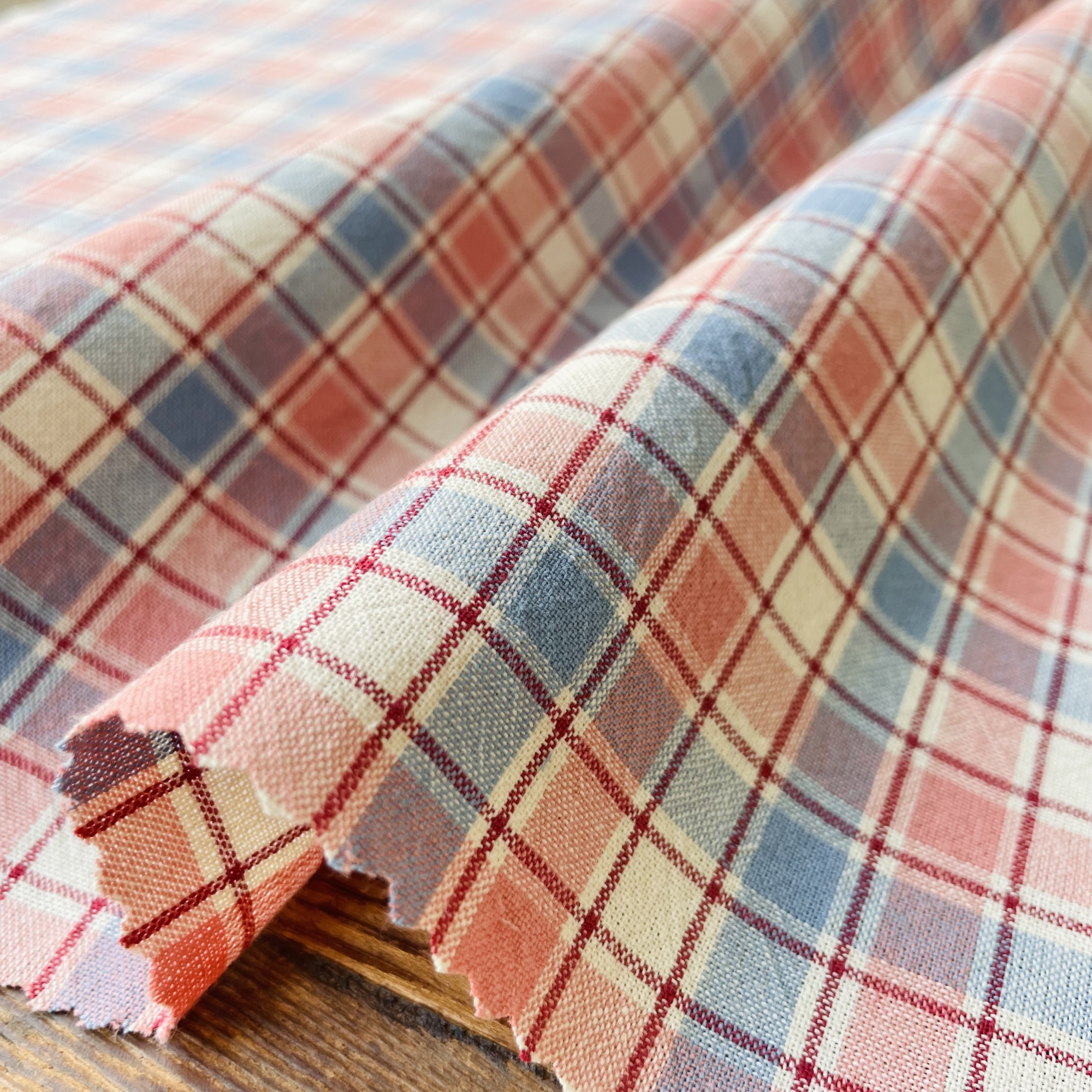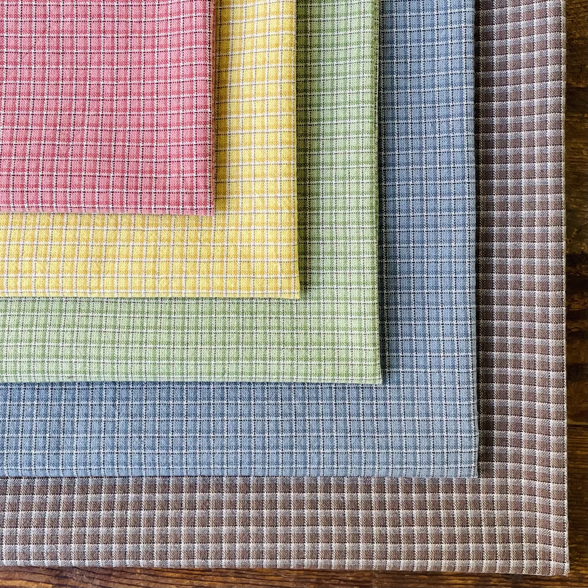 今回、新しい試みで表面がなめらかで無地調の色を楽しめる先染めを作ってみました。先染めはプリントより肉厚感のあるものが多いですが、今回、より細い糸を使用し、アメリカのアンティークキルトで使われているような、フラットでシャツ地ライクな生地に仕上げました。