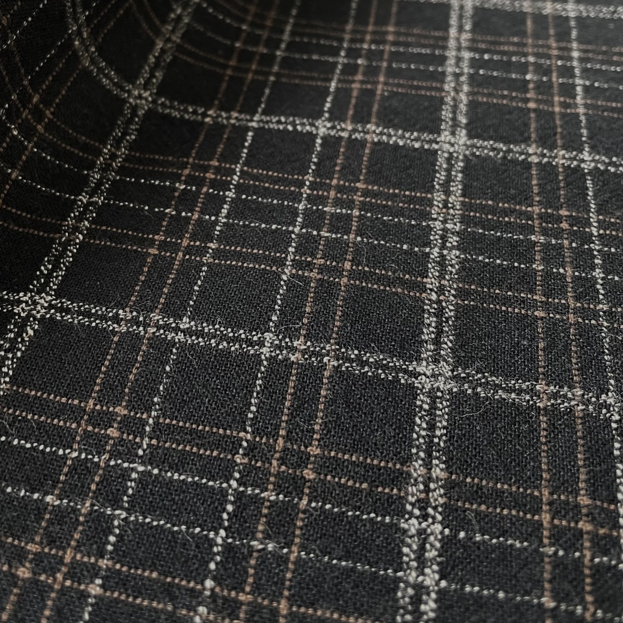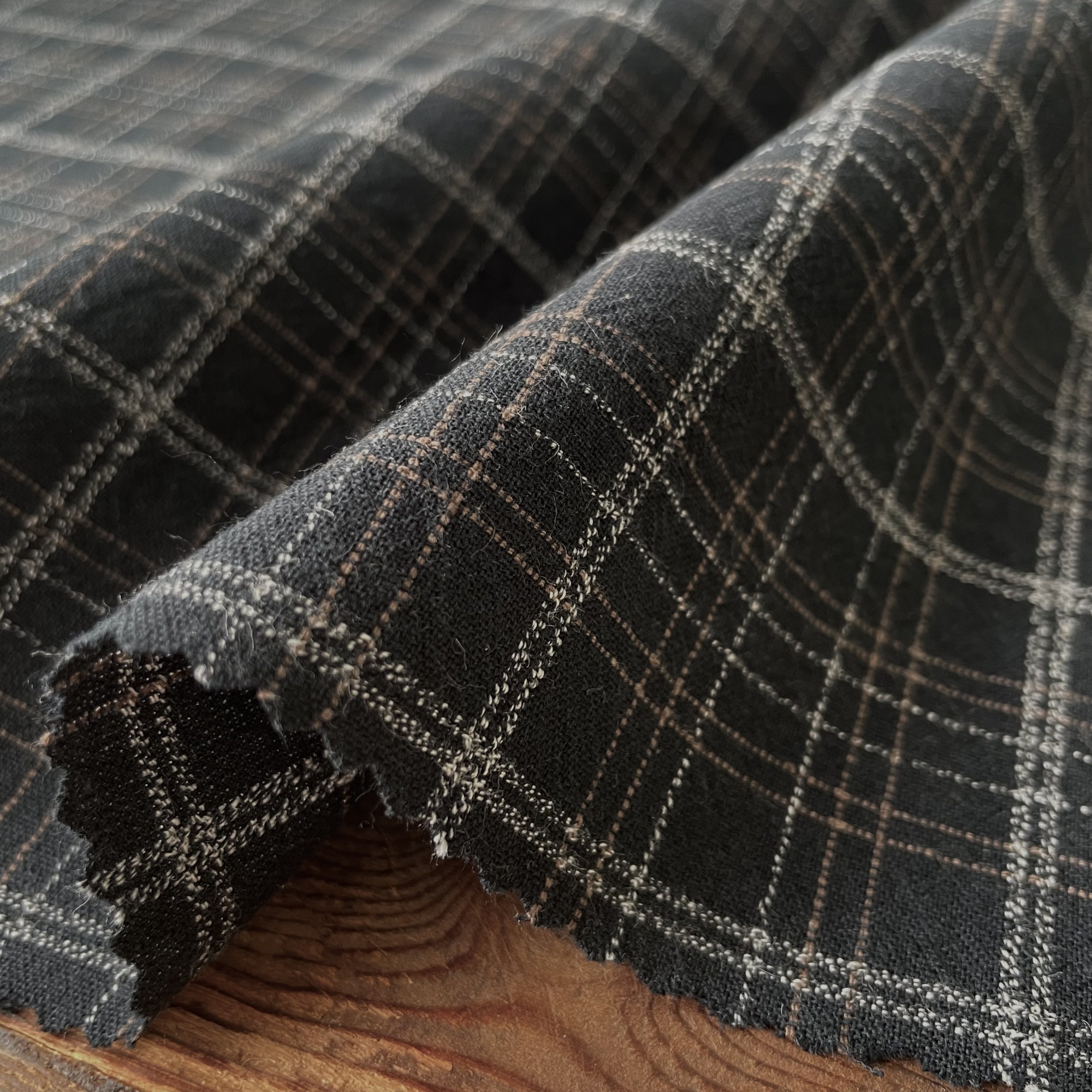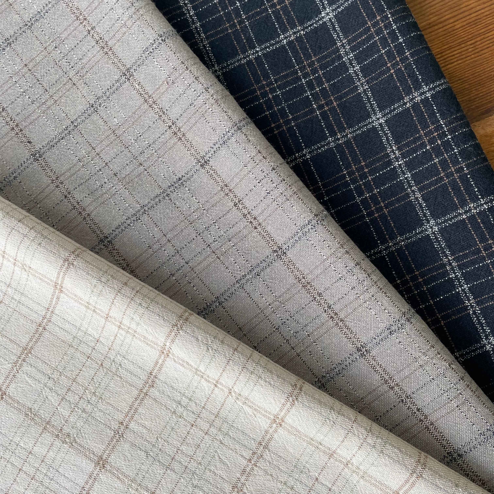 こちらは全色、タテ糸に日本でしか染められない「スペック染」の糸を使用した硬派なチェックです。シンプルな柄のアクセントになっているのは、太い格子の上に乗るステッチラインと、大きな格子の間にある、ほのかに色を感じる細いライン。色味が少なく見えますが、じっくり見ると効かせ色が何色も使われている凝ったチェックです。