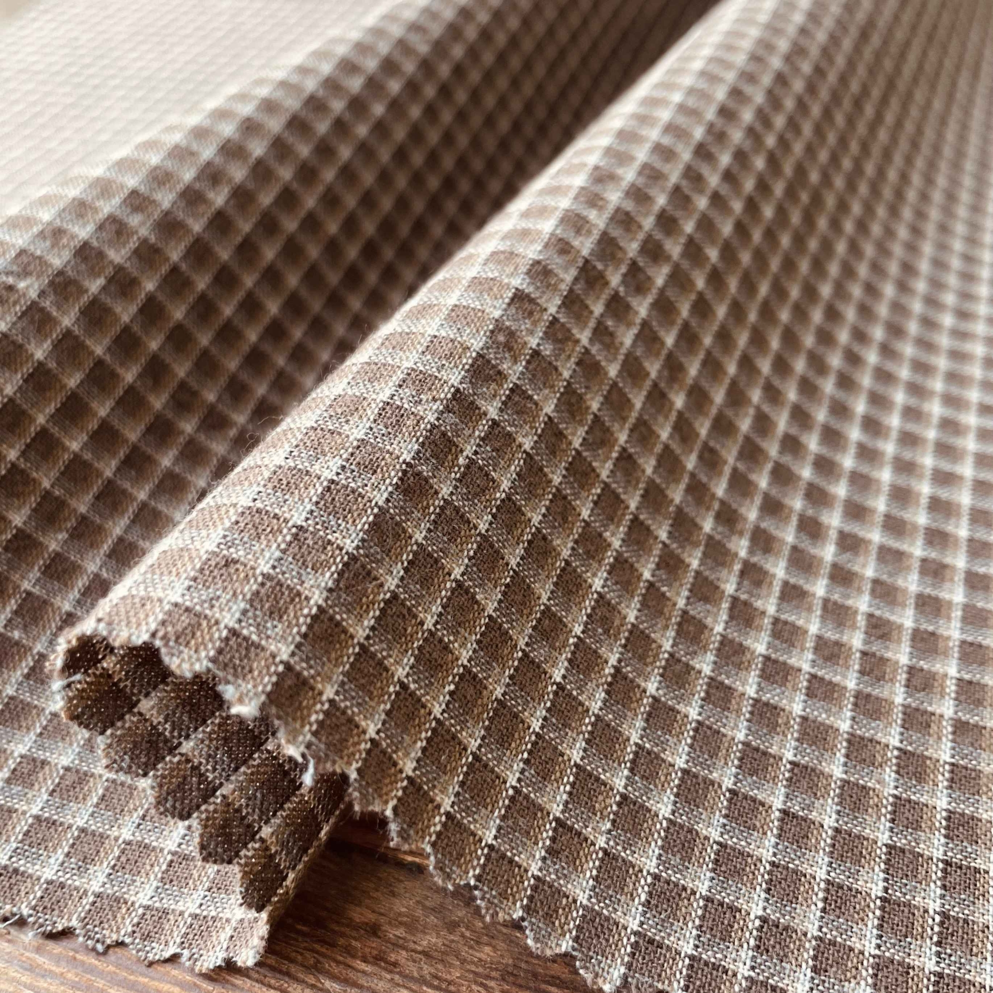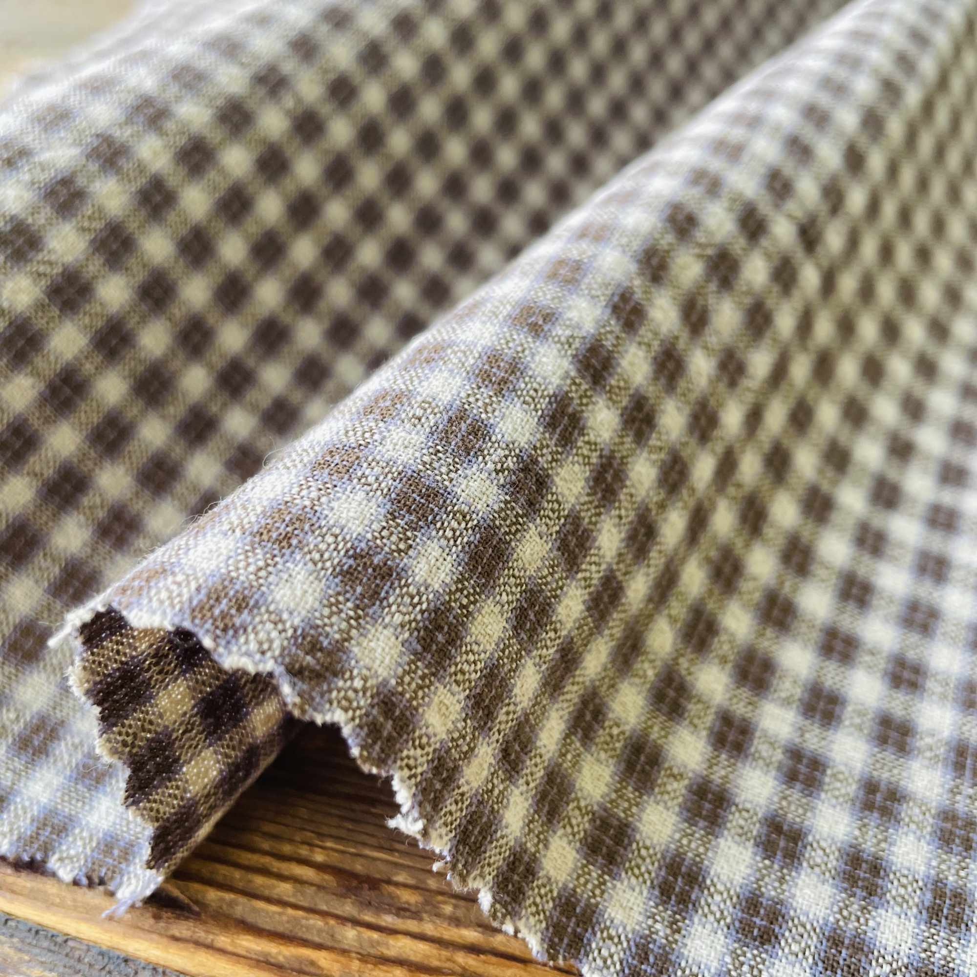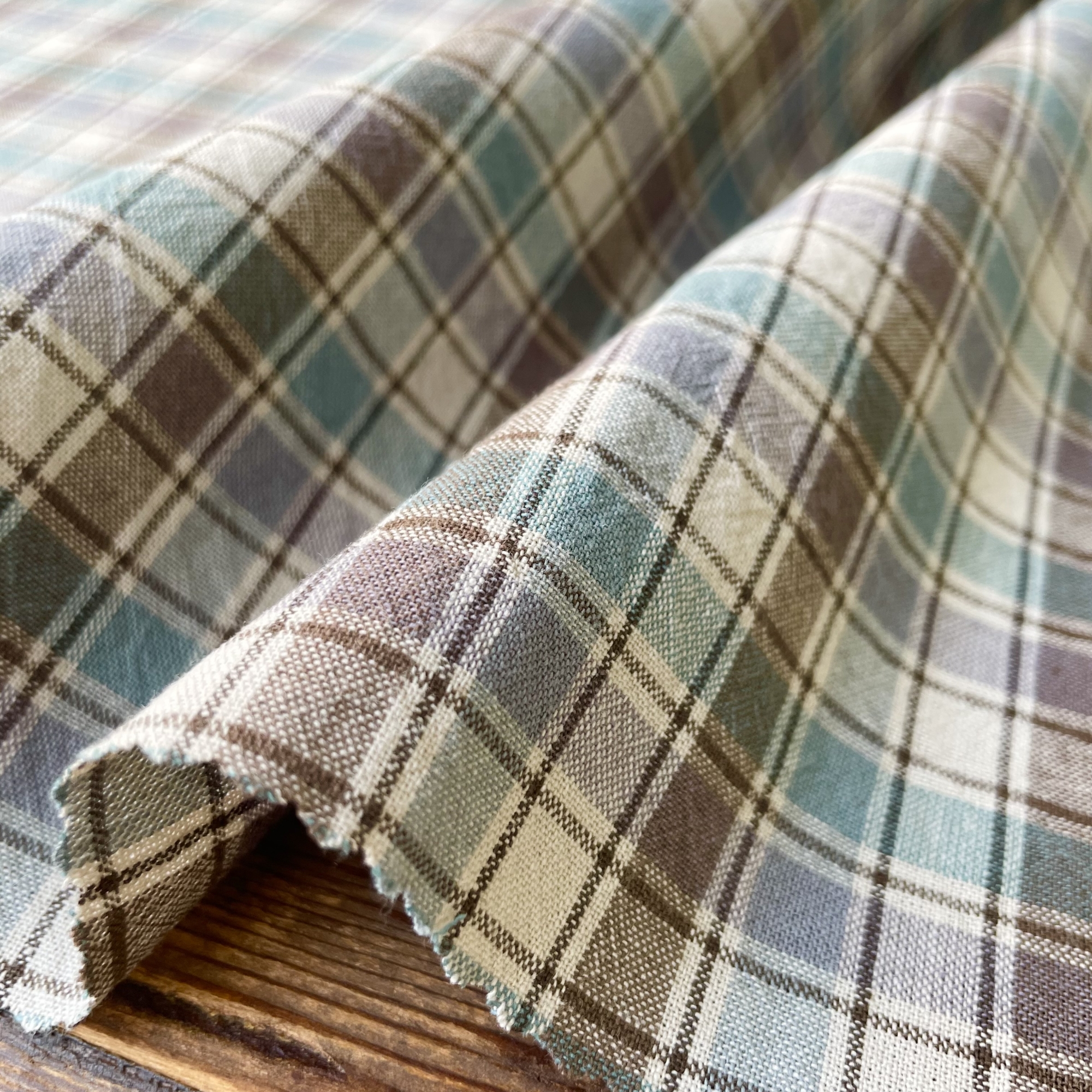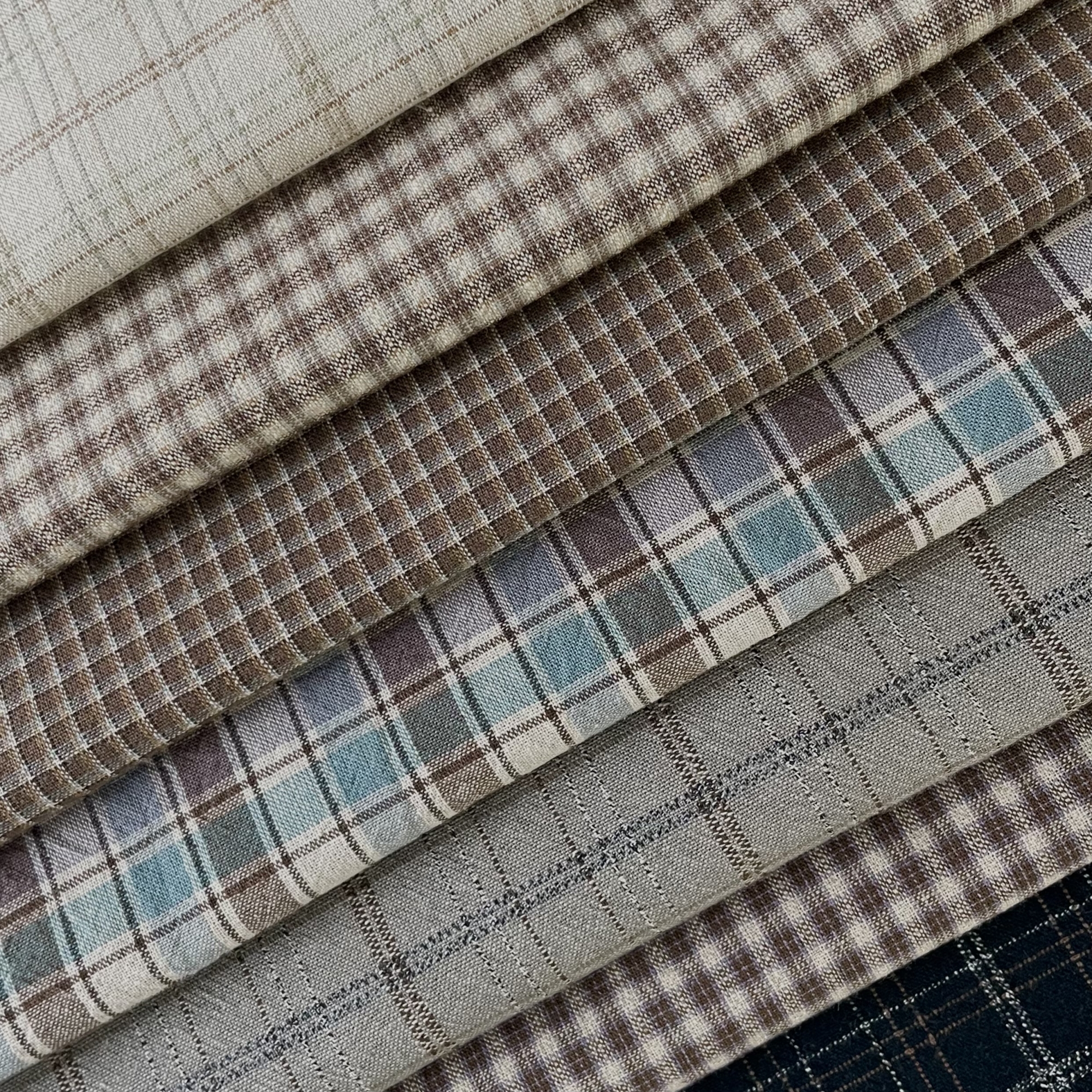 2cm×2.5cmの使いやすいサイズのプレーンなチェックですが、同系の濃淡がオンブレ調の色の深みを感じさせます。メインカラーの上にドビー織りのラインが入ることで立体的な表情を見せています。