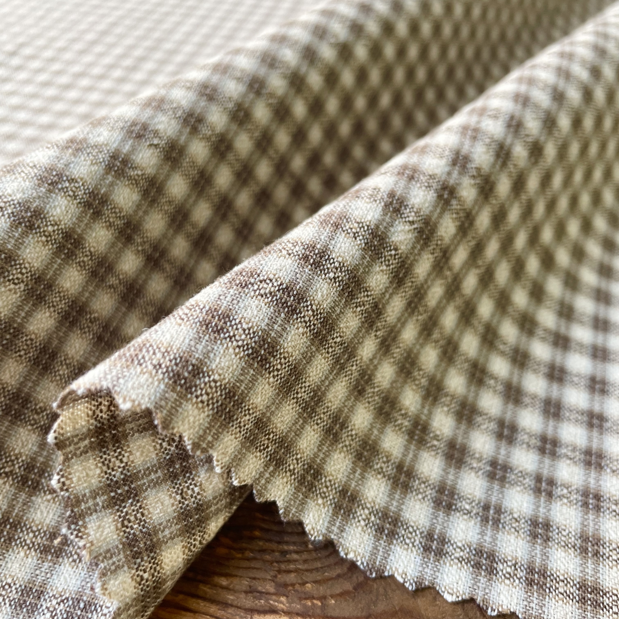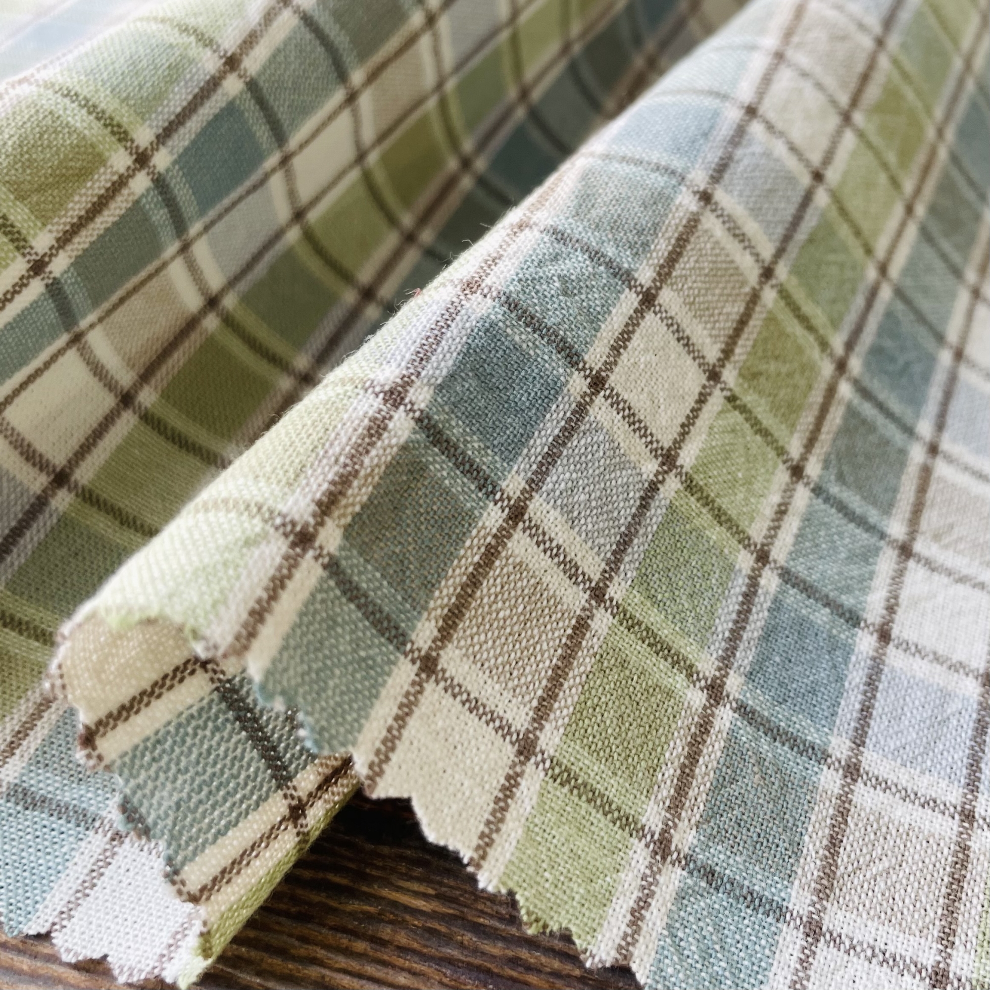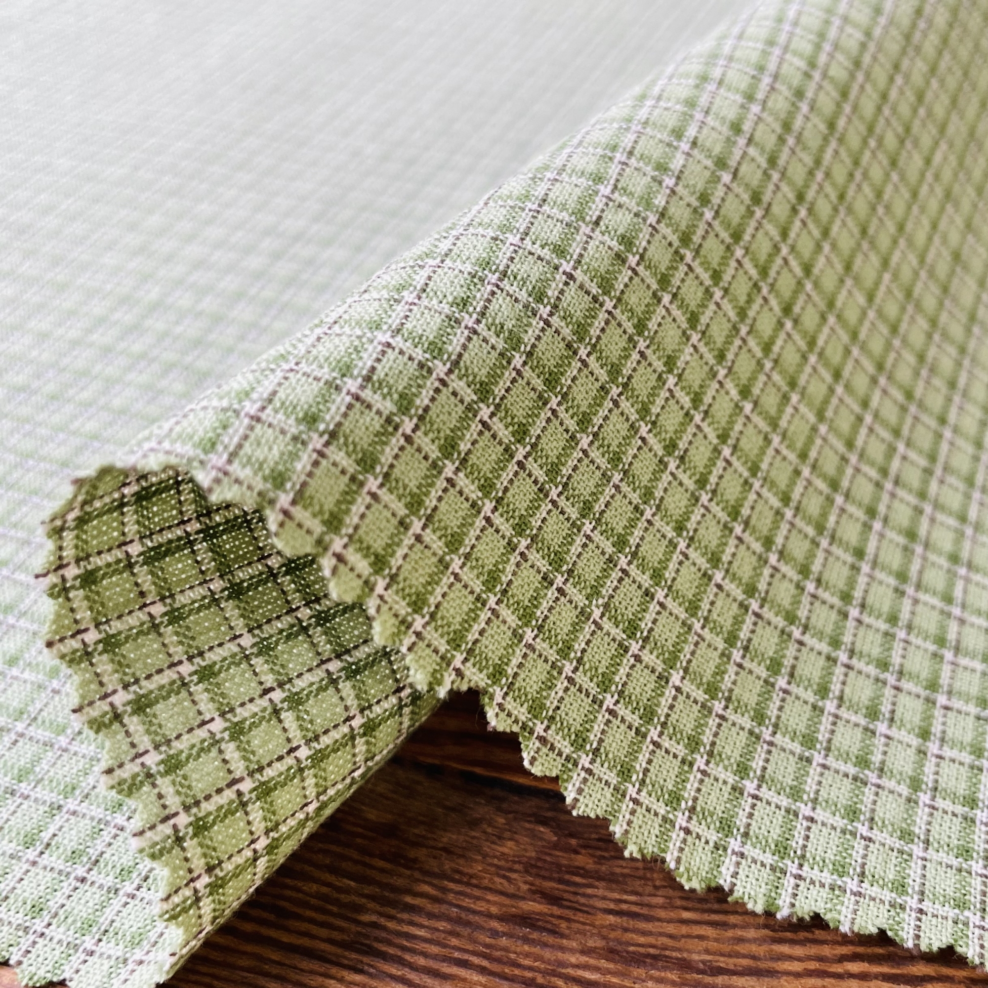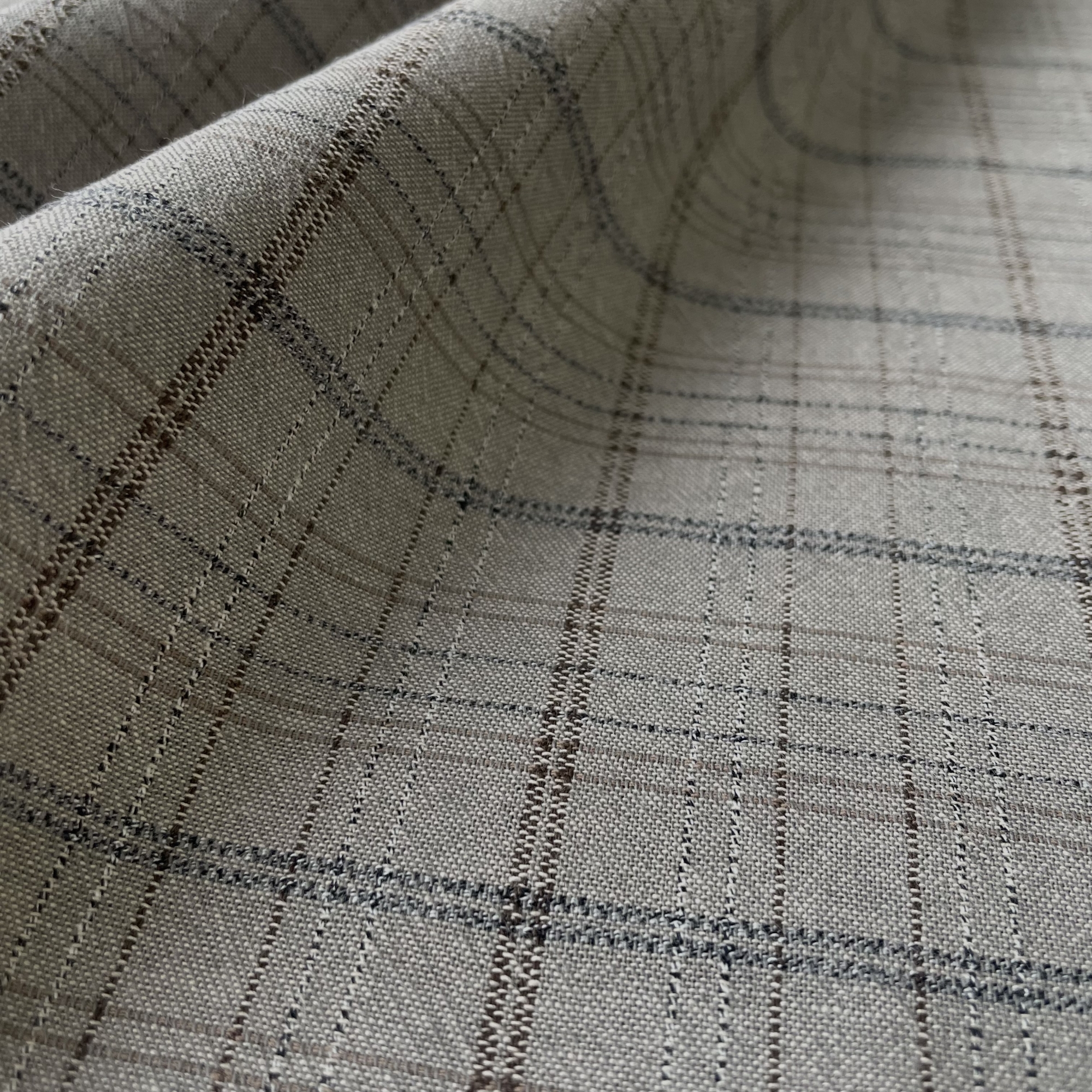 2cm×2.5cmの使いやすいサイズのプレーンなチェックですが、同系の濃淡がオンブレ調の色の深みを感じさせます。メインカラーの上にドビー織りのラインが入ることで立体的な表情を見せています。