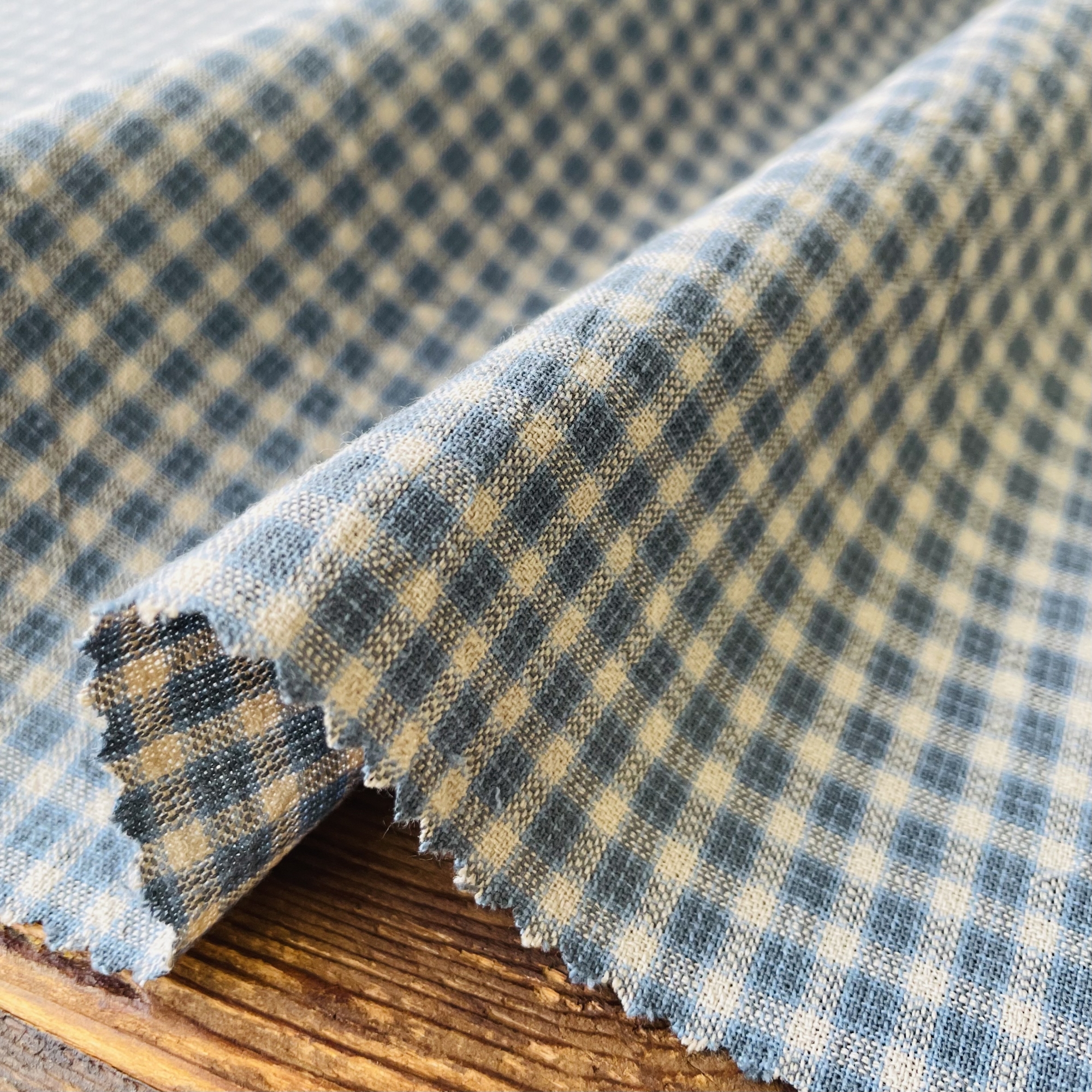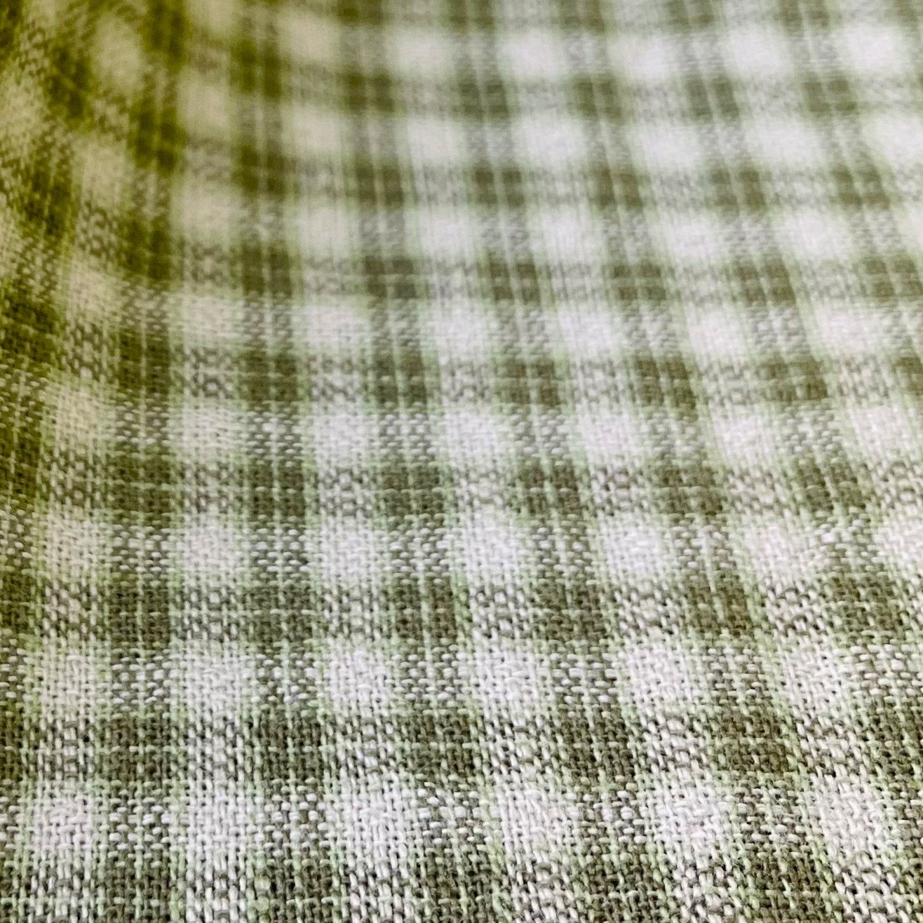 ギンガムチェックを少しアレンジした変わりギンガム。チェックのピッチを少しイレギュラーにしました。色糸の両端に引き揃えにした少し濃色を置くことで、柄が引き締まって見えます。